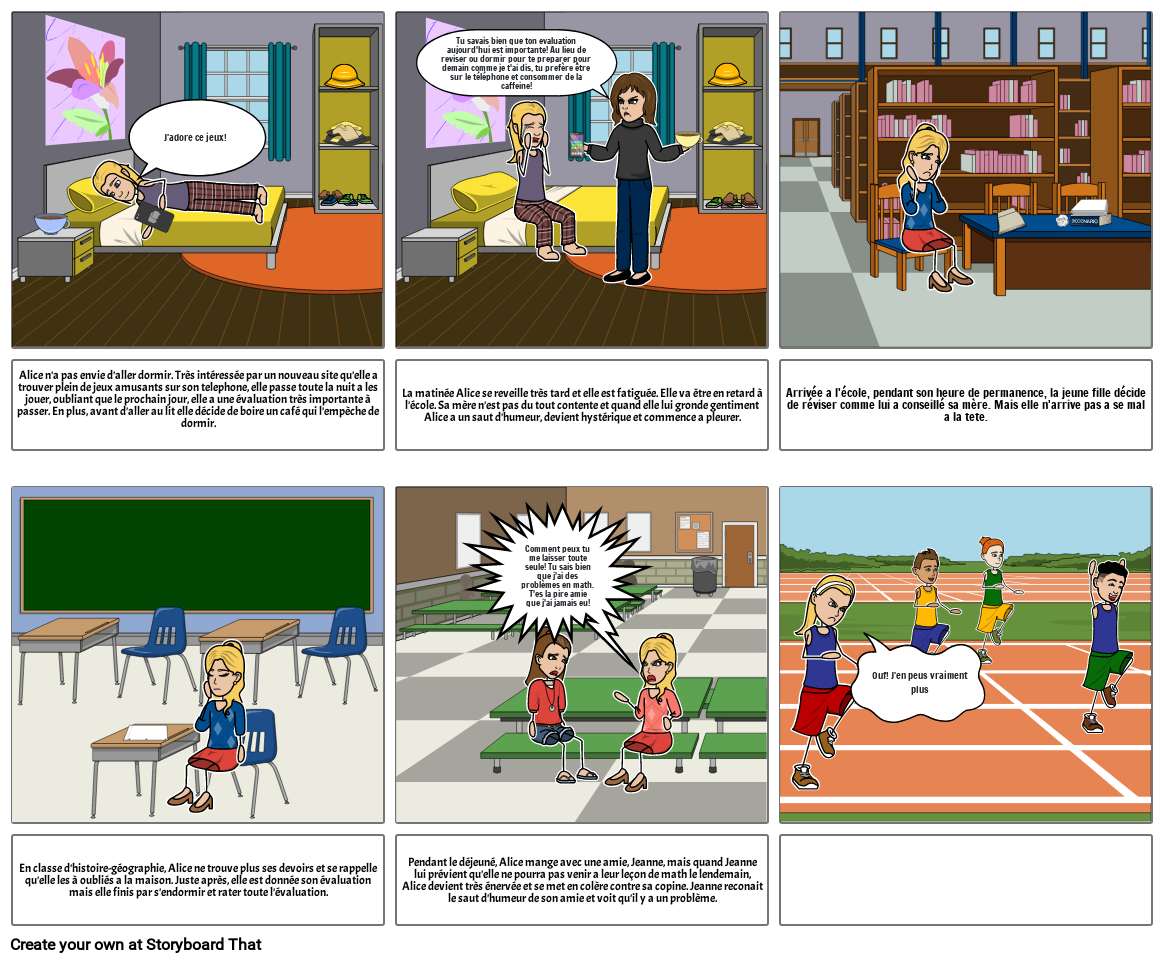 Alice n'a pas envie d'aller dormir. Très intéressée par un nouveau site qu'elle a trouver plein de jeux amusants sur son telephone, elle passe toute la nuit a les jouer, oubliant que le prochain jour, elle a une évaluation très importante à passer. En plus, avant d'aller au lit elle décide de boire un café qui l'empèche de dormir.