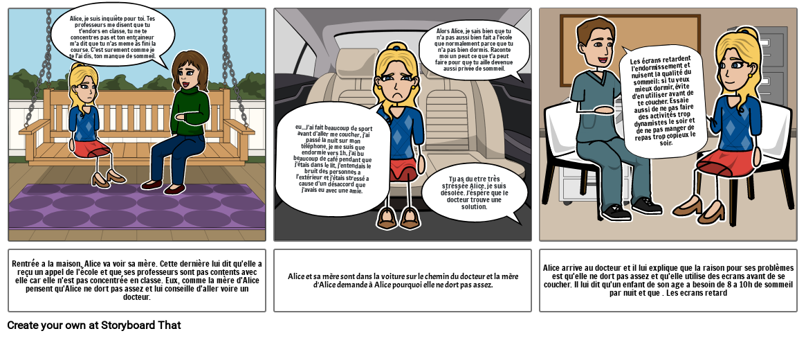 Alice arrive au docteur et il lui explique que la raison pour ses problèmes est qu'elle ne dort pas assez et qu'elle utilise des ecrans avant de se coucher. Il lui dit qu'un enfant de son age a besoin de 8 a 10h de sommeil par nuit et que . Les ecrans retard