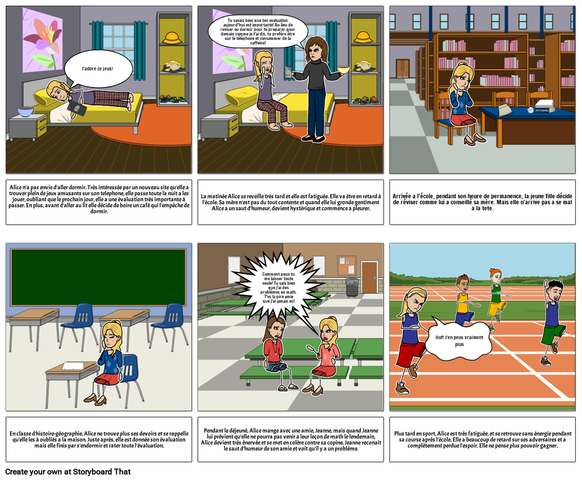 Alice n'a pas envie d'aller dormir. Très intéressée par un nouveau site qu'elle a trouver plein de jeux amusants sur son telephone, elle passe toute la nuit a les jouer, oubliant que le prochain jour, elle a une évaluation très importante à passer. En plus, avant d'aller au lit elle décide de boire un café qui l'empèche de dormir.