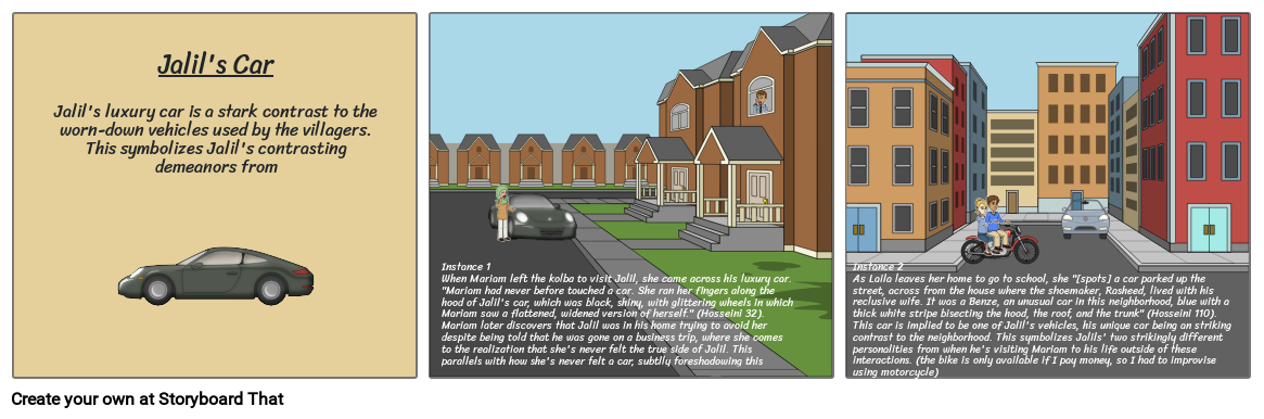 Instance 2As Laila leaves her home to go to school, she "[spots] a car parked up the street, across from the house where the shoemaker, Rasheed, lived with his reclusive wife. It was a Benze, an unusual car in this neighborhood, blue with a thick white stripe bisecting the hood, the roof, and the trunk" (Hosseini 110). This car is implied to be one of Jalil's vehicles, his unique car being an striking contrast to the neighborhood. This symbolizes Jalils' two strikingly different personalities from when he's visiting Mariam to his life outside of these interactions. (the bike is only available if I pay money, so I had to improvise using motorcycle)