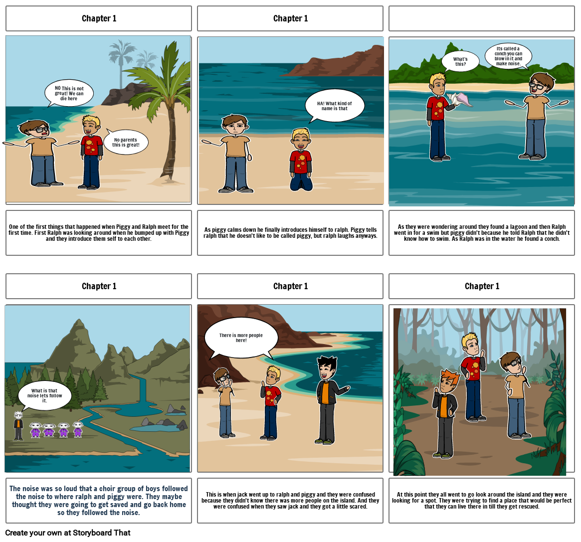 One of the first things that happened when Piggy and Ralph meet for the first time. First Ralph was looking around when he bumped up with Piggy and they introduce them self to each other.