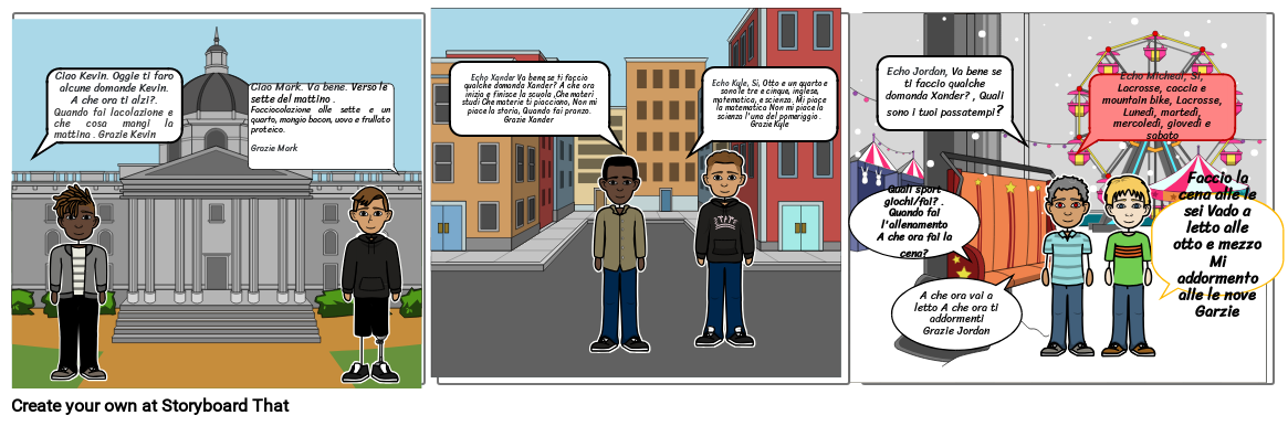 Echo Xander Va bene se ti faccio qualche domanda Xander? A che ora inizia e finisce la scuola ,Che materi studi Che materie ti piacciono, Non mi piace la storia, Quando fai pranzo. Grazie Xander