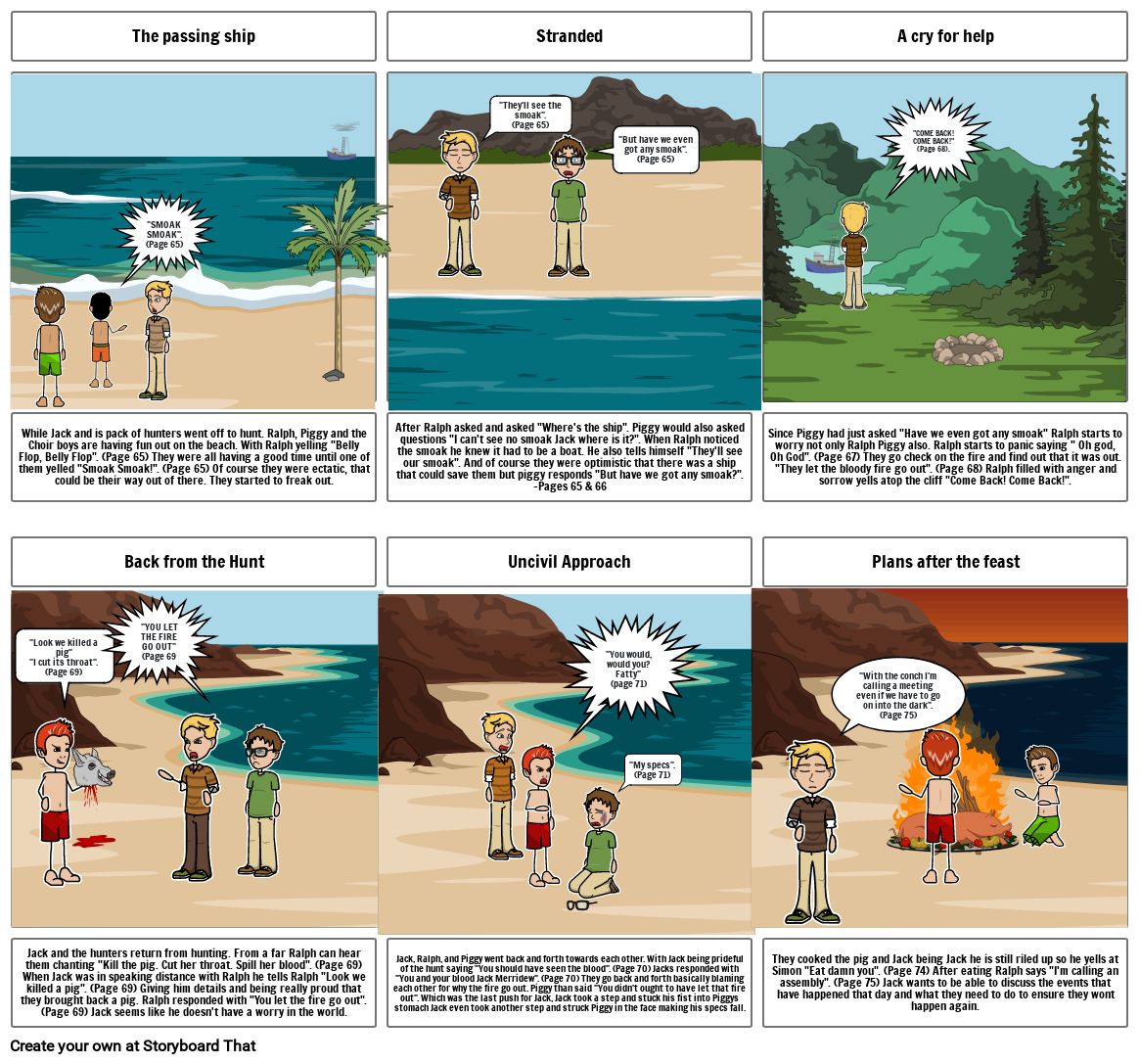 Jack and the hunters return from hunting. From a far Ralph can hear them chanting "Kill the pig. Cut her throat. Spill her blood". (Page 69) When Jack was in speaking distance with Ralph he tells Ralph "Look we killed a pig". (Page 69) Giving him details and being really proud that they brought back a pig. Ralph responded with "You let the fire go out". (Page 69) Jack seems like he doesn't have a worry in the world.