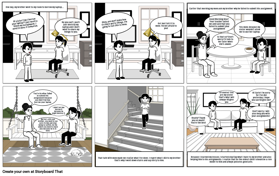 Because I learned my lesson, I started sharing what I have to my brother and also helping him to his assignments. I realize that as the oldest child I should be a role model to him and always possess good acts.