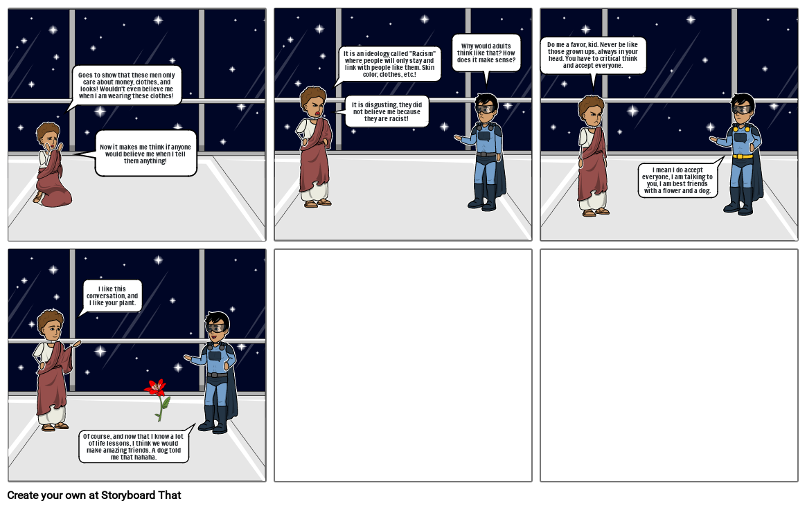 Do me a favor, kid. Never be like those grown ups, always in your head. You have to critical think and accept everyone.