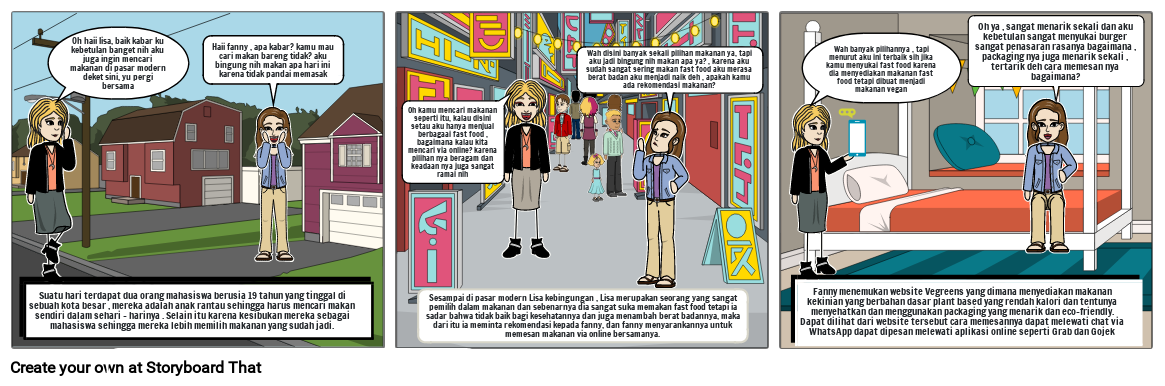 Fanny menemukan website Vegreens yang dimana menyediakan makanan kekinian yang berbahan dasar plant based yang rendah kalori dan tentunya menyehatkan dan menggunakan packaging yang menarik dan eco-friendly. Dapat dilihat dari website tersebut cara memesannya dapat melewati chat via WhatsApp dapat dipesan melewati aplikasi online seperti Grab dan Gojek