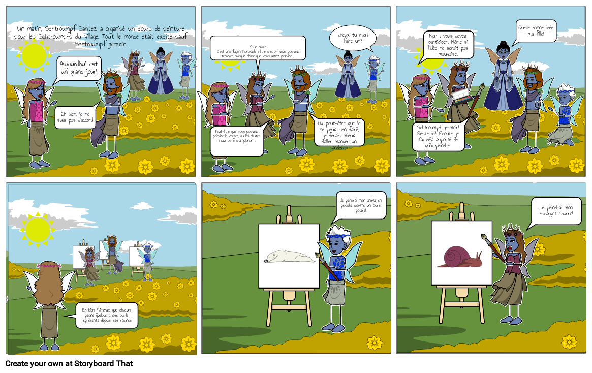 Un matin, Schtroumpf Santéz a organisé un cours de peinture pour les Schtroumpfs du village. Tout le monde était excité sauf Schtroumpf germoir.