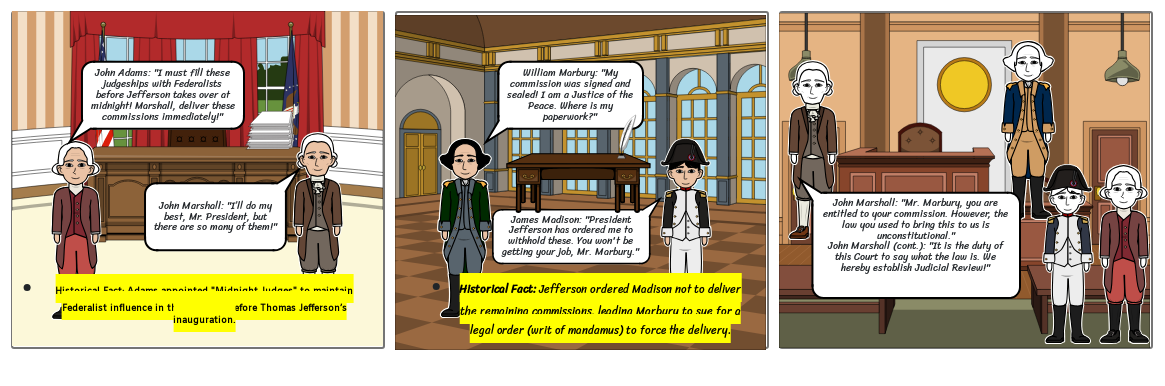 John Marshall: "Mr. Marbury, you are entitled to your commission. However, the law you used to bring this to us is unconstitutional."John Marshall (cont.): "It is the duty of this Court to say what the law is. We hereby establish Judicial Review!"