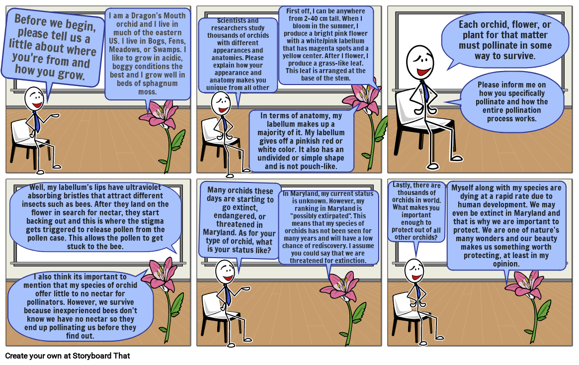 I am a Dragon's Mouth orchid and I live in much of the eastern US. I live in Bogs, Fens, Meadows, or Swamps. I like to grow in acidic, boggy conditions the best and I grow well in beds of sphagnum moss.