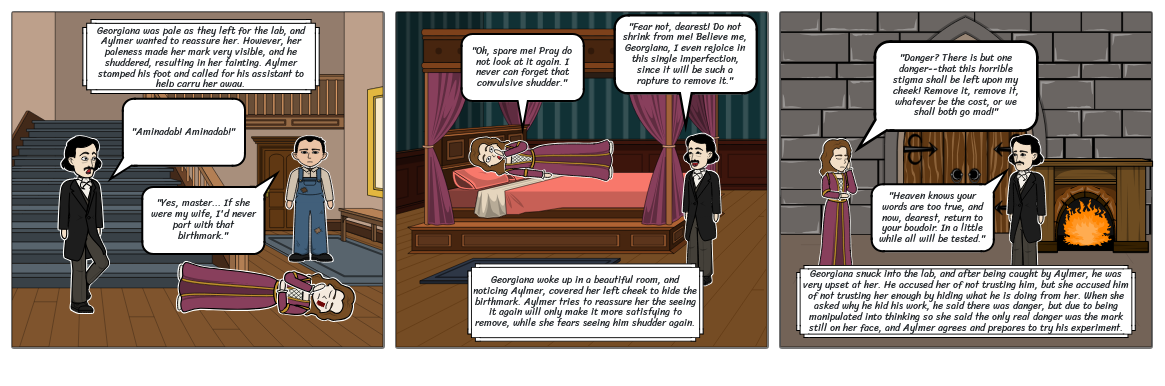 Georgiana woke up in a beautiful room, and noticing Aylmer, covered her left cheek to hide the birthmark. Aylmer tries to reassure her the seeing it again will only make it more satisfying to remove, while she fears seeing him shudder again.