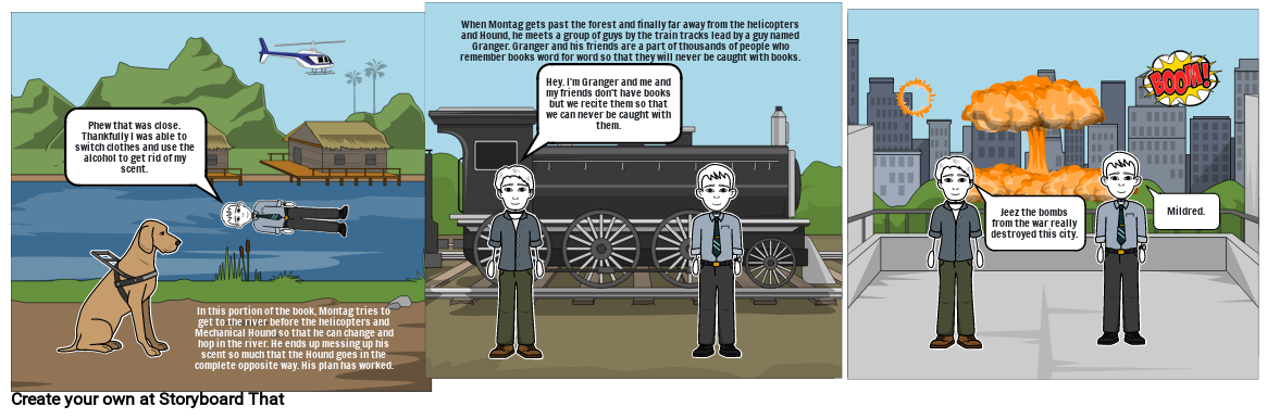 When Montag gets past the forest and finally far away from the helicopters and Hound, he meets a group of guys by the train tracks lead by a guy named Granger. Granger and his friends are a part of thousands of people who remember books word for word so that they will never be caught with books.