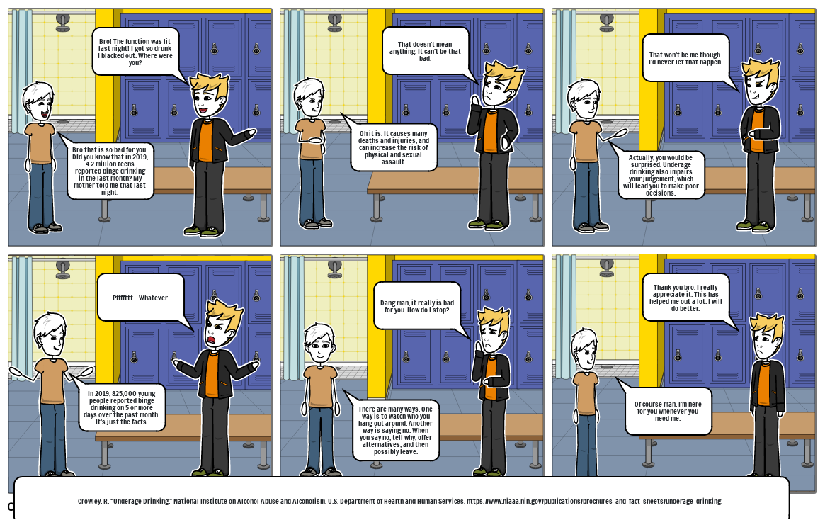 Crowley, R. “Underage Drinking.” National Institute on Alcohol Abuse and Alcoholism, U.S. Department of Health and Human Services, https://www.niaaa.nih.gov/publications/brochures-and-fact-sheets/underage-drinking.