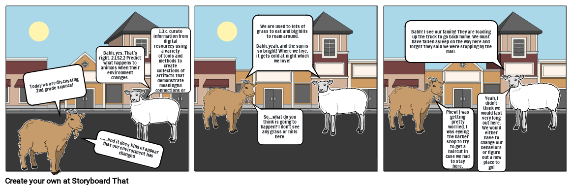 Bahh, yes. That's right. 2.LS2.2 Predict what happens to animals when their environment changes.