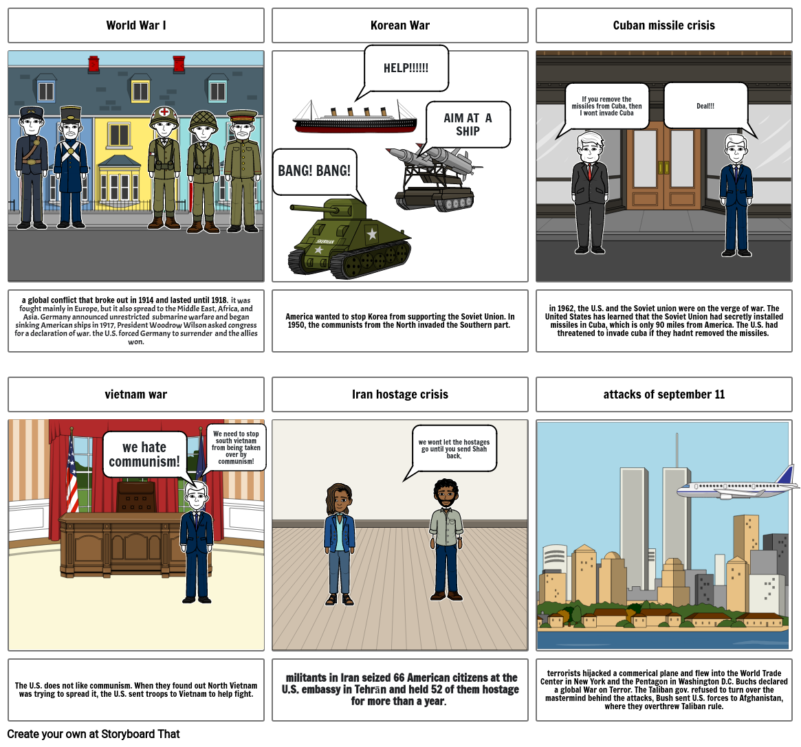 terrorists hijacked a commerical plane and flew into the World Trade Center in New York and the Pentagon in Washington D.C. Buchs declared a global War on Terror. The Taliban gov. refused to turn over the mastermind behind the attacks, Bush sent U.S. forces to Afghanistan, where they overthrew Taliban rule.