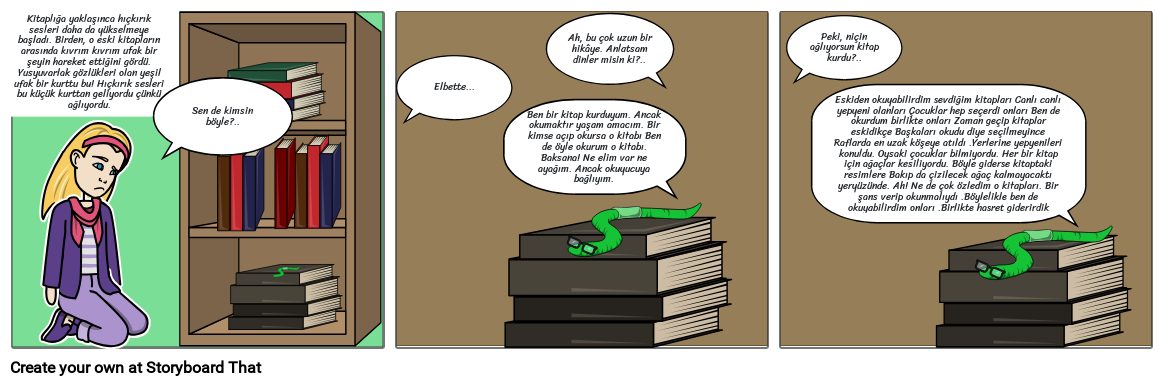 Kitaplığa yaklaşınca hıçkırık sesleri daha da yükselmeye başladı. Birden, o eski kitapların arasında kıvrım kıvrım ufak bir şeyin hareket ettiğini gördü. Yusyuvarlak gözlükleri olan yeşil ufak bir kurttu bu! Hıçkırık sesleri bu küçük kurttan geliyordu çünkü ağlıyordu.