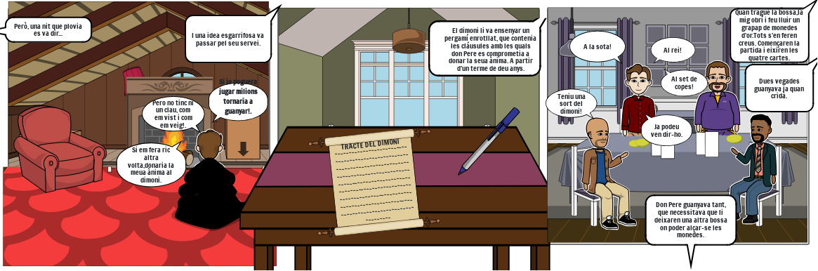 El dimoni li va ensenyar un pergamí enrotllat, que contenia les cláusules amb les quals don Pere es comprometia a donar la seua ànima. A partir d'un terme de deu anys.