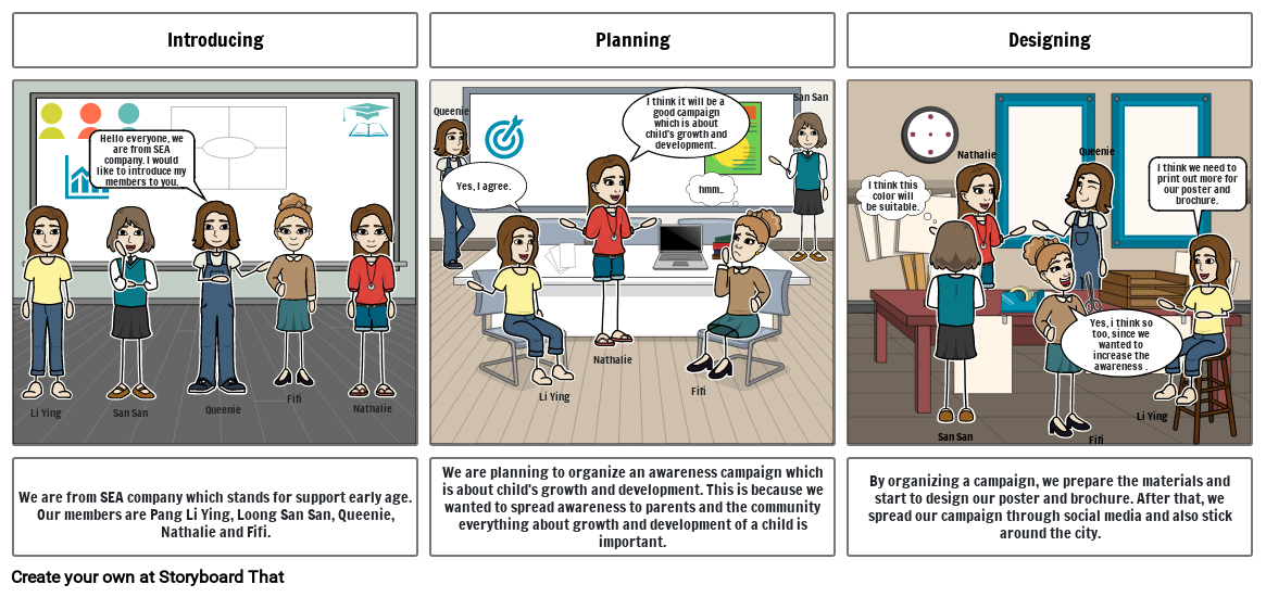 We are from SEA company which stands for support early age. Our members are Pang Li Ying, Loong San San, Queenie,Nathalie and Fifi.