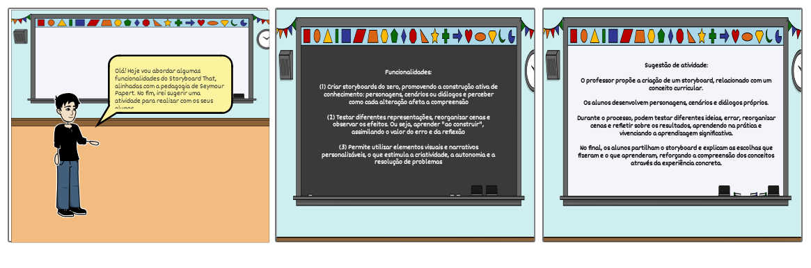 Funcionalidades:(1) Criar storyboards do zero, promovendo a construção ativa de conhecimento: personagens, cenários ou diálogos e perceber como cada alteração afeta a compreensão(2) Testar diferentes representações, reorganizar cenas e observar os efeitos. Ou seja, aprender "ao construir", assimilando o valor do erro e da reflexão(3) Permite utilizar elementos visuais e narrativos personalizáveis, o que estimula a criatividade, a autonomia e a resolução de problemas