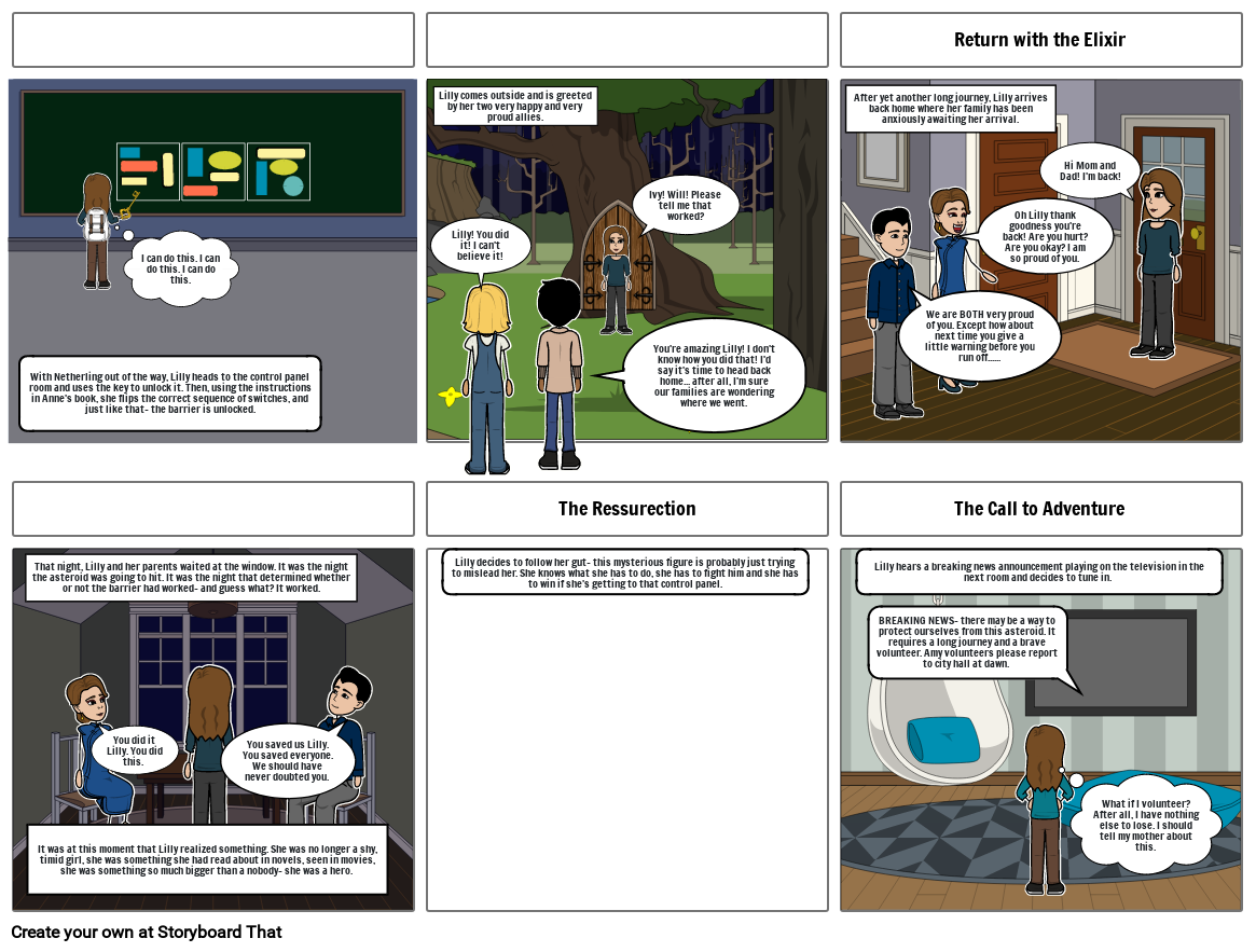 It was at this moment that Lilly realized something. She was no longer a shy, timid girl, she was something she had read about in novels, seen in movies, she was something so much bigger than a nobody- she was a hero.