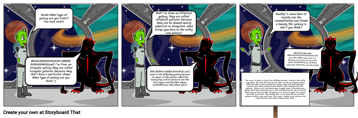 This comic Is about 2 aliens from different galaxies coming to the milky way galaxy. The talk about how one of them is from an irregular galaxy while the other is from an elliptical galaxy. They talk about why their galaxies have these specific names which is the arrangement of the galaxies. They go on to talk about what brought them to the Milky way galaxy which was mainly because of the constellations but also for one of them cause of the area that the galaxy is in. Since its apart of a cluster called the local group. They mainly want to see constellations and then perhaps be able to see some stars. This comic is about starts galaxies and constellations and 2 aliens talking about them.