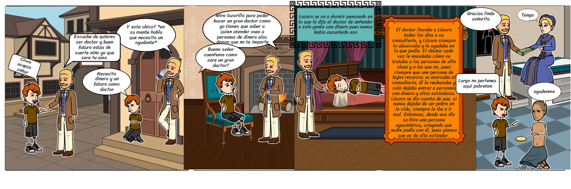 El doctor llevaba a Lázaro todos los días a su consultorio, y Lázaro siempre lo observaba y lo ayudaba en lo que podía. El doctor cada vez le enseñaba cómo se trataba a las personas de alta clase y a las que no, pues siempre que una persona de bajos recursos se acercaba al consultorio, él la rechazaba y solo dejaba entrar a personas con dinero y altos estándares.Lázaro se dio cuenta de que, si nunca dejaba de ser pobre en la vida, siempre le iba a ir mal. Entonces, desde ese día se hizo una persona egocéntrica, creyendo que nadie podía con él, pues piensa que es de alto estándar.