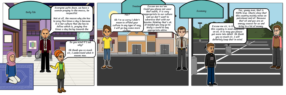Excuse me ma'am.Could you please not wear that outfit, it is very inappropriate to our culture and we don't want to advertise that with our females thinking that's ok. If needed you may go to Wally's world to buy appropriate attire.