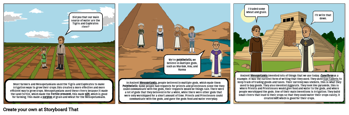In Ancient Mesopotamia, people believed in multiple gods, which made them Polytheistic. Some people had requests for priests and priestesses since the they could communicate with the gods, their requests would be things rain. There were a lot of gods that they believed in for a while, while there were other gods that were only worshipped for a short amount of time. Priests and Priestesses could communicate with the gods, and gave the gods food and water everyday.