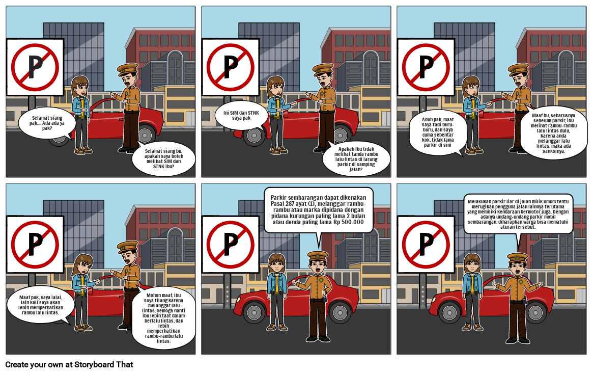 Maaf bu, seharusnya sebelum parkir, ibu melihat rambu-rambu lalu lintas dulu, karena anda melanggar lalu lintas, maka ada sanksinya.