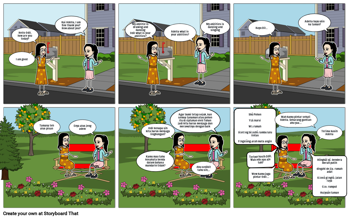 Hóngbái qí: bendera merah putihdingzhi de jia: rumah adatGāosù gōnglù: jalan rayaCǎo: rumputHuāyuán taman
