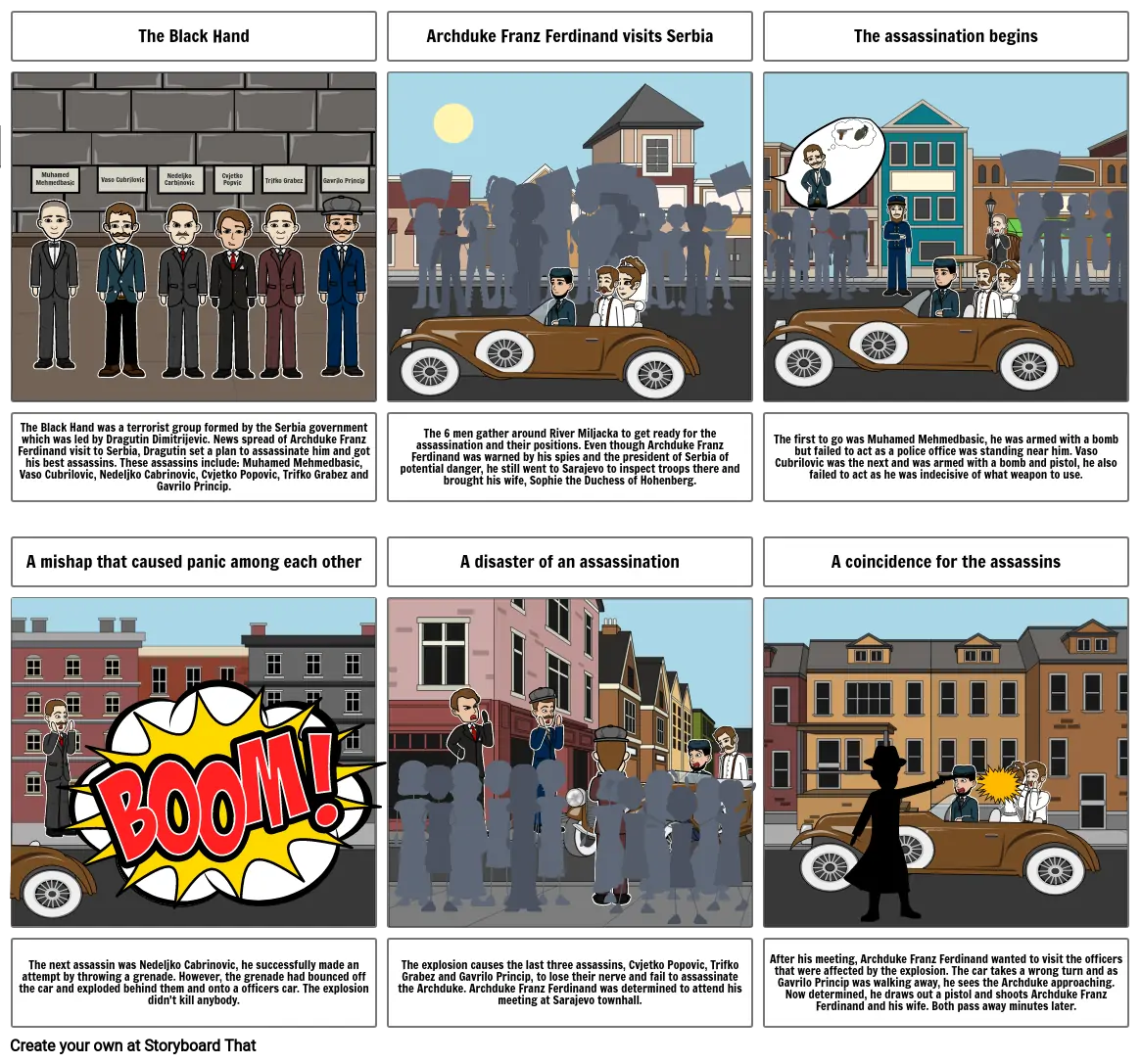 The Black Hand was a terrorist group formed by the Serbia government which was led by Dragutin Dimitrijevic. News spread of Archduke Franz Ferdinand visit to Serbia, Dragutin set a plan to assassinate him and got his best assassins. These assassins include: Muhamed Mehmedbasic, Vaso Cubrilovic, Nedeljko Cabrinovic, Cvjetko Popovic, Trifko Grabez and Gavrilo Princip.