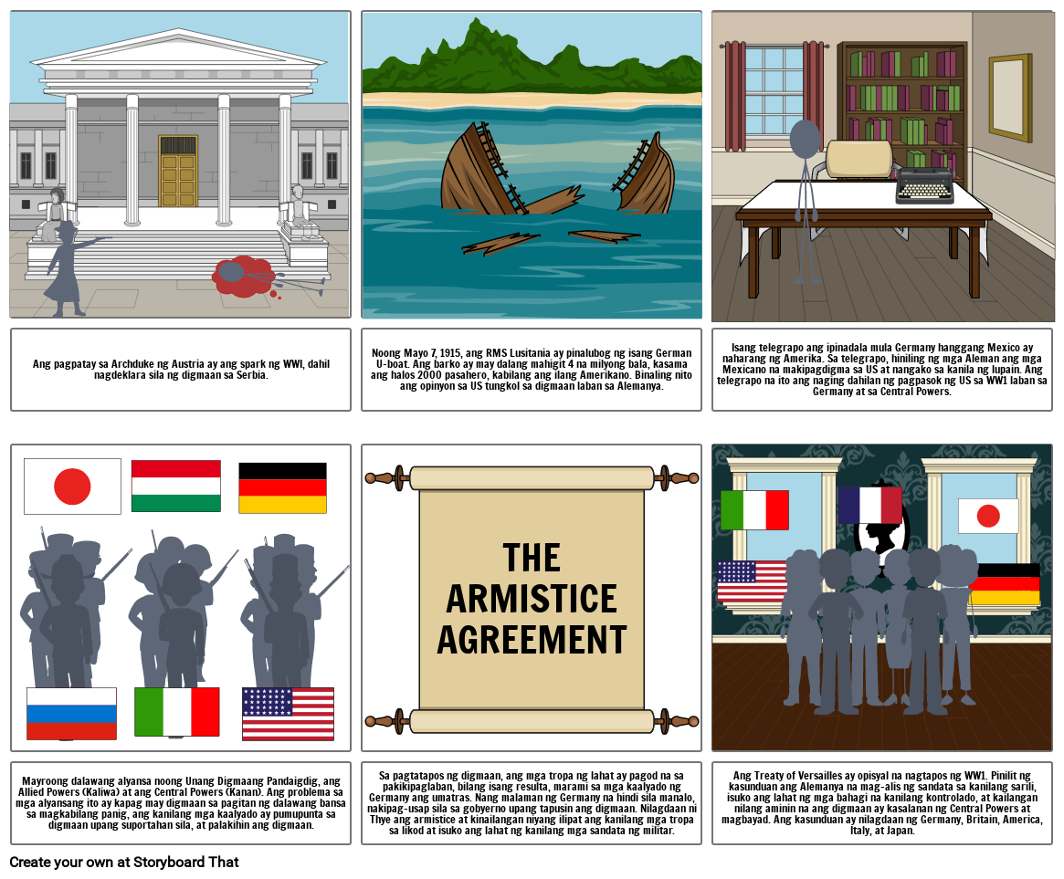 Ang Treaty of Versailles ay opisyal na nagtapos ng WW1. Pinilit ng kasunduan ang Alemanya na mag-alis ng sandata sa kanilang sarili, isuko ang lahat ng mga bahagi na kanilang kontrolado, at kailangan nilang aminin na ang digmaan ay kasalanan ng Central Powers at magbayad. Ang kasunduan ay nilagdaan ng Germany, Britain, America, Italy, at Japan.