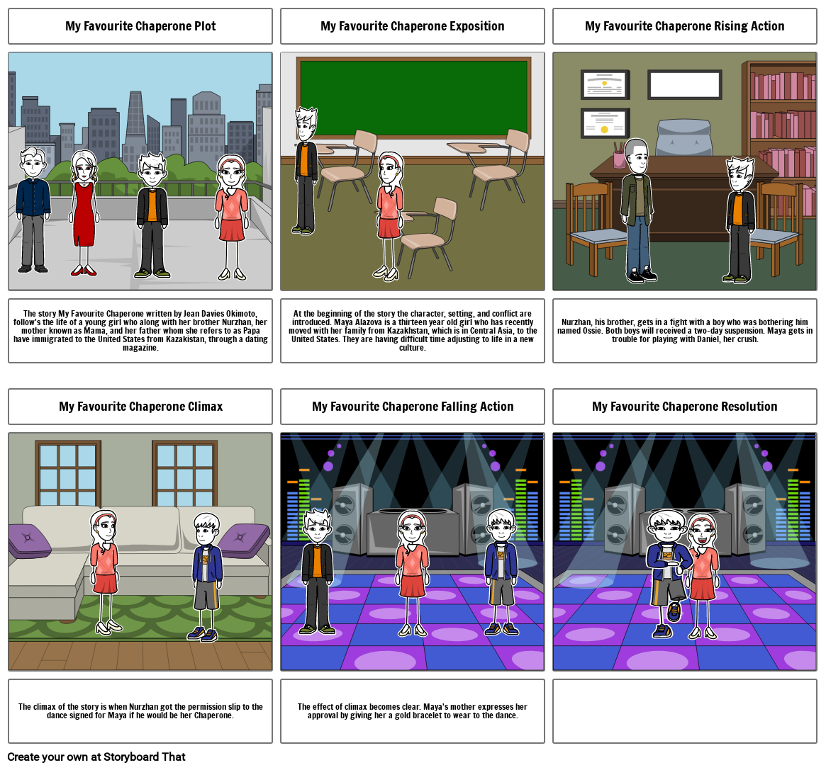 The story My Favourite Chaperone written by Jean Davies Okimoto, follow's the life of a young girl who along with her brother Nurzhan, her mother known as Mama, and her father whom she refers to as Papa have immigrated to the United States from Kazakistan, through a dating magazine.