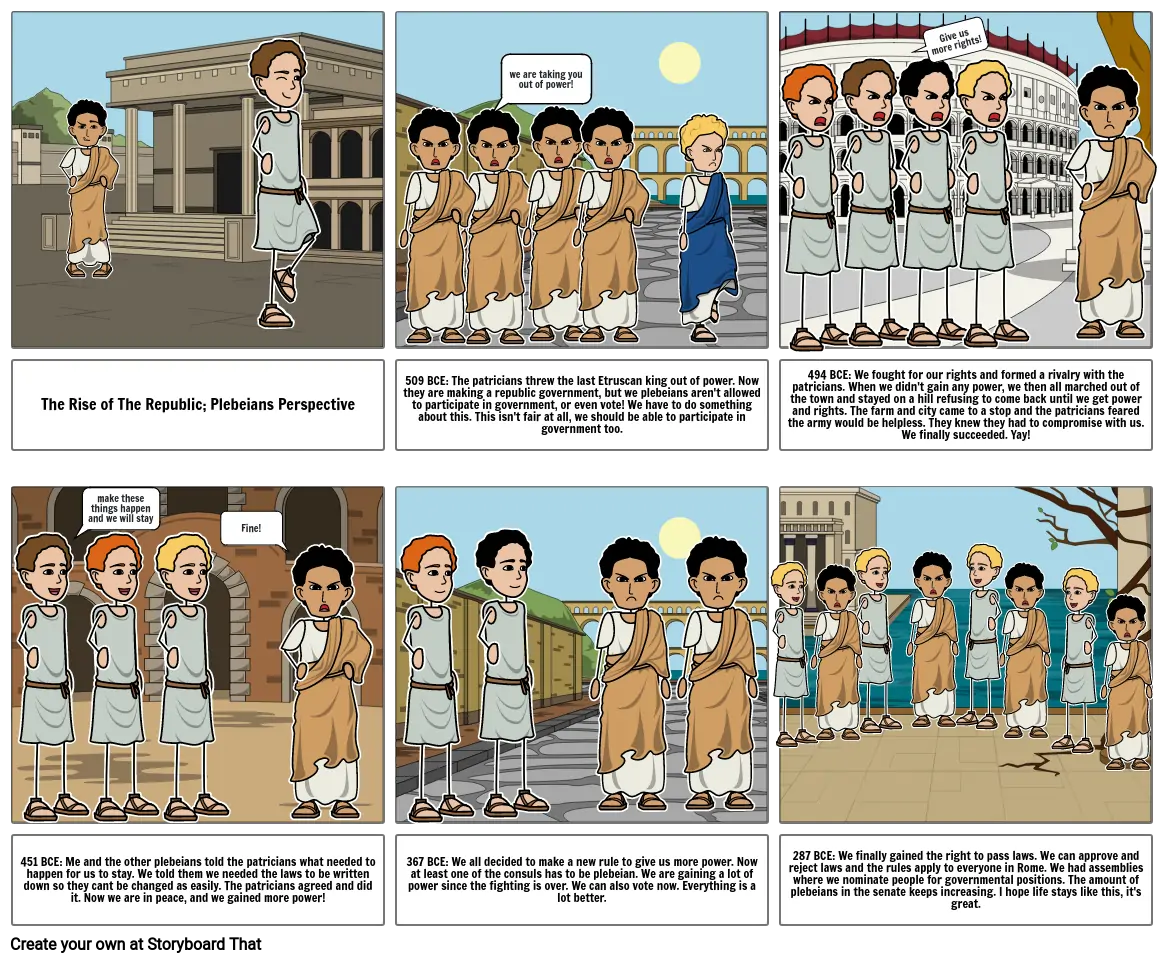 509 BCE: The patricians threw the last Etruscan king out of power. Now they are making a republic government, but we plebeians aren't allowed to participate in government, or even vote! We have to do something about this. This isn't fair at all, we should be able to participate in government too.