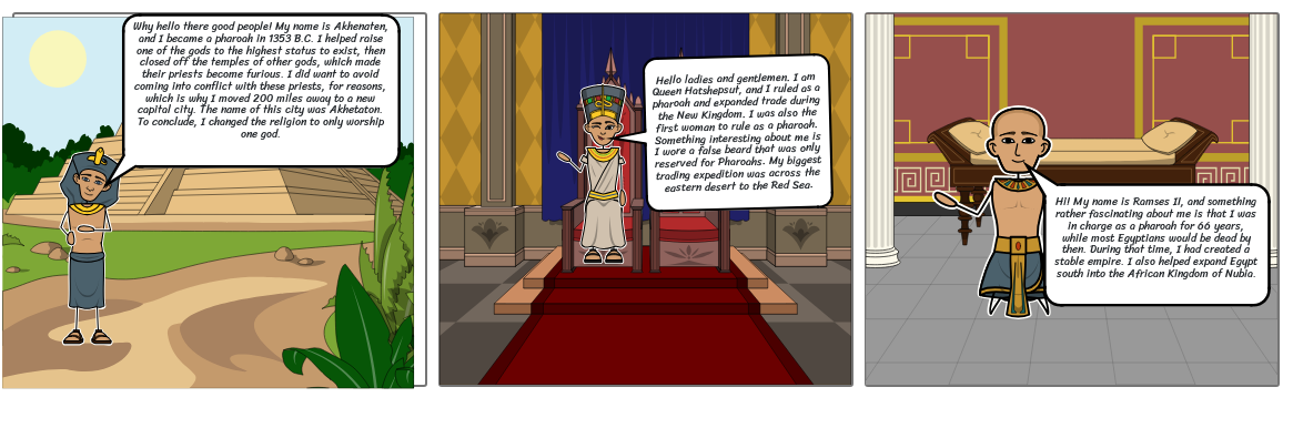 Hello ladies and gentlemen. I am Queen Hatshepsut, and I ruled as a pharoah and expanded trade during the New Kingdom. I was also the first woman to rule as a pharoah. Something interesting about me is I wore a false beard that was only reserved for Pharoahs. My biggest trading expedition was across the eastern desert to the Red Sea.