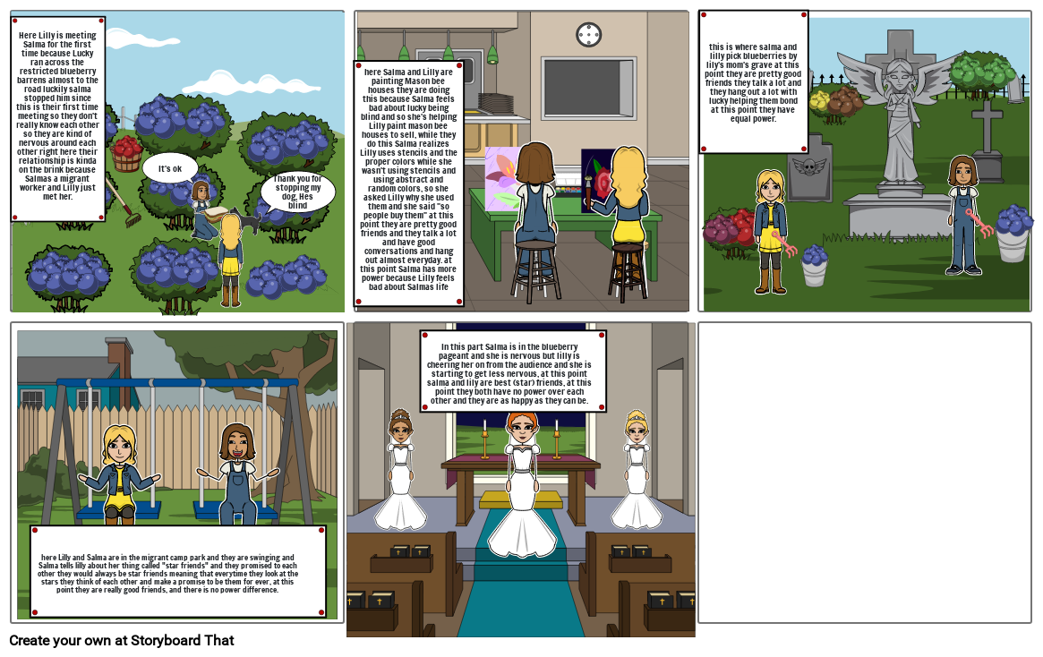 here Salma and Lilly are painting Mason bee houses they are doing this because Salma feels bad about lucky being blind and so she's helping Lilly paint mason bee houses to sell, while they do this Salma realizes Lilly uses stencils and the proper colors while she wasn't using stencils and using abstract and random colors, so she asked Lilly why she used them and she said "so people buy them" at this point they are pretty good friends and they talk a lot and have good conversations and hang out almost everyday. at this point Salma has more power because Lilly feels bad about Salmas life