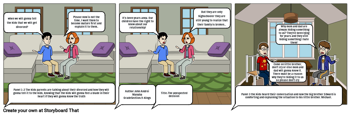 Panel 1-2 The kids parents are talking about their divorced and how they will gonna tell it to the kids, knowing that the kids will gonna feel a blade in their heart if they will gonna know the truth
