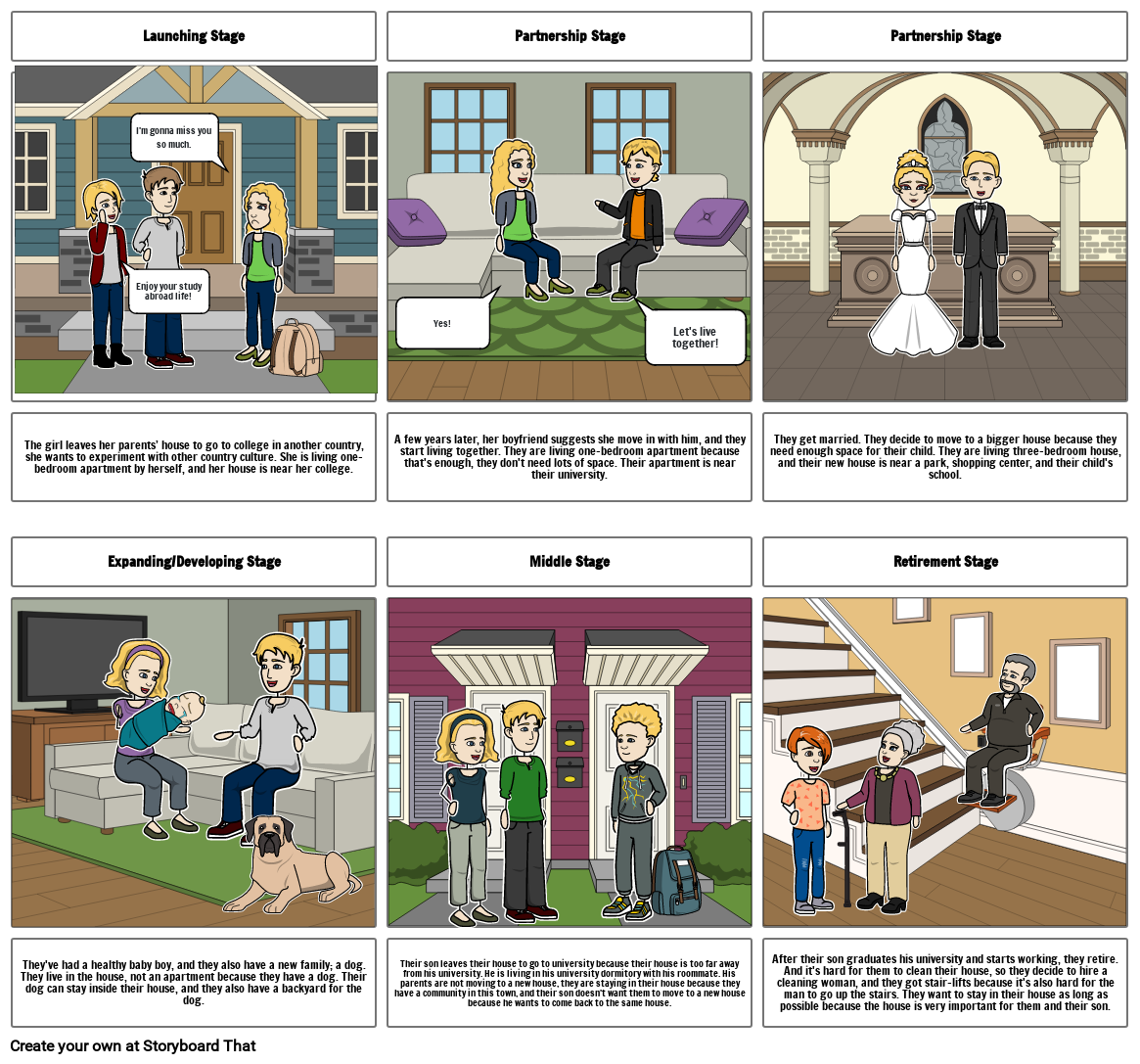 They get married. They decide to move to a bigger house because they need enough space for their child. They are living three-bedroom house, and their new house is near a park, shopping center, and their child's school.
