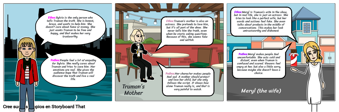 Pathos:People feel a lot of empathy for Sylvia. She really cares about Truman and tries to save him. Her emotions are real. She gives the audience hope that Truman will discover the truth and live a real life.