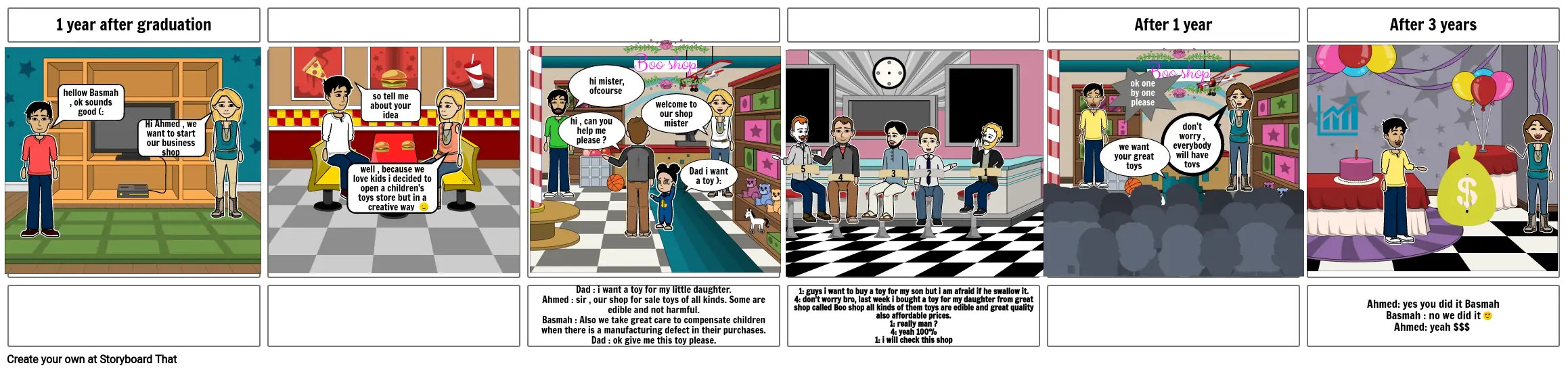 Dad : i want a toy for my little daughter.Ahmed : sir , our shop for sale toys of all kinds. Some are edible and not harmful.Basmah : Also we take great care to compensate children when there is a manufacturing defect in their purchases.Dad : ok give me this toy please.