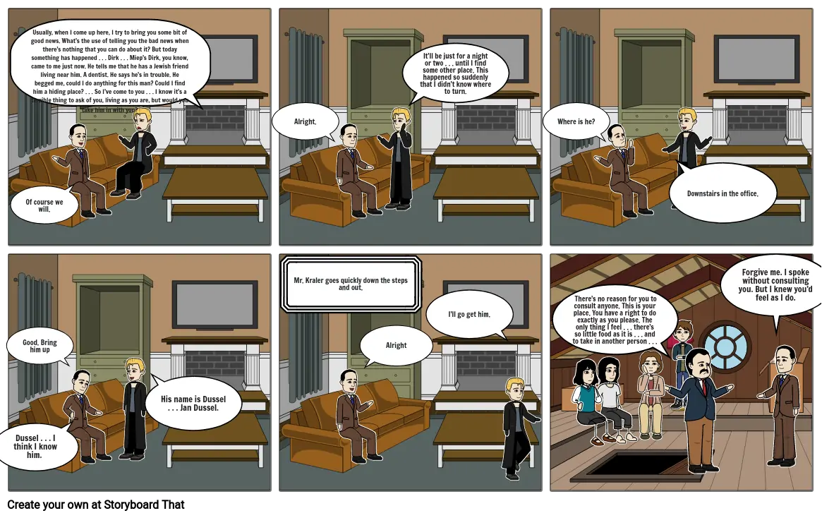 Usually, when I come up here, I try to bring you some bit of good news. What’s the use of telling you the bad news when there’s nothing that you can do about it? But today something has happened . . . Dirk . . . Miep’s Dirk, you know, came to me just now. He tells me that he has a Jewish friend living near him. A dentist. He says he’s in trouble. He begged me, could I do anything for this man? Could I find him a hiding place? . . . So I’ve come to you . . . I know it’s a terrible thing to ask of you, living as you are, but would you take him in with you?