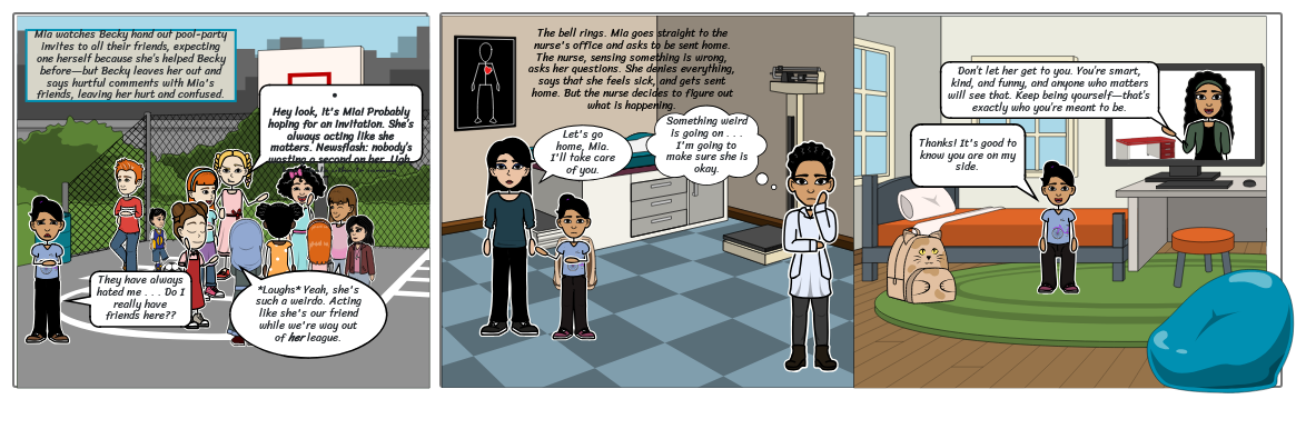 Soon, the school day ends and the nurse calls Mia on her laptop. She asks her if she really is genuinely not fine. Mia breaks down and tells her everything about Becky an her friends. She feels reassured and glad that she is supported.