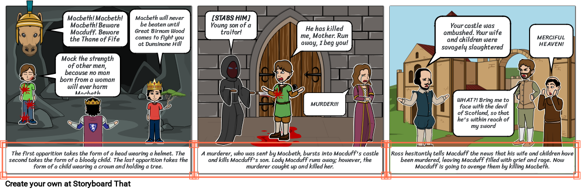 A murderer, who was sent by Macbeth, bursts into Macduff's castle and kills Macduff's son. Lady Macduff runs away; however, the murderer caught up and killed her.