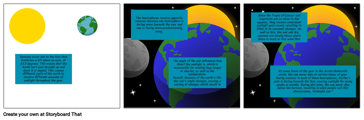 Seasons occur due to the fact that Earth has a tilt about an axis, of 23.5 degrees. This means that the Earth isn't just straight up and down it is angled. This causes different parts of the earth to receive different amounts of sunlight throughout the year.