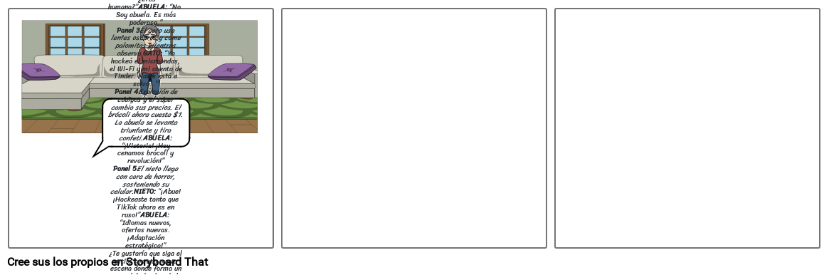 “Si el súper no baja los precios... los bajo yo. A la fuerza. 🦾”Panel 2La abuela digita a velocidad supersónica. Aparece el mensaje: “Accediendo a la bóveda secreta de descuentos.”DIÁLOGO DEL SISTEMA:SISTEMA: “¿Eres humana?”ABUELA: “No. Soy abuela. Es más poderoso.”Panel 3El gato usa lentes oscuros y come palomitas mientras observa.GATO: “Ya hackeó el microondas, el Wi-Fi y mi cuenta de Tinder. Nadie está a salvo…”Panel 4Explosión de códigos y el súper cambia sus precios. El brócoli ahora cuesta $1. La abuela se levanta triunfante y tira confeti.ABUELA: “¡Victoria! ¡Hoy cenamos brócoli y revolución!”Panel 5El nieto llega con cara de horror, sosteniendo su celular.NIETO: “¡Abue! ¡Hackeaste tanto que TikTok ahora es en ruso!”ABUELA: “Idiomas nuevos, ofertas nuevas. ¡Adaptación estratégica!”¿Te gustaría que siga el estilo con una nueva escena donde forma un escuadrón hacker de la tercera edad? O tal vez un episodio especial donde ella se infiltra en una convención de influencers fingiendo ser gamer retro… Estoy lista para seguir la travesura 😄