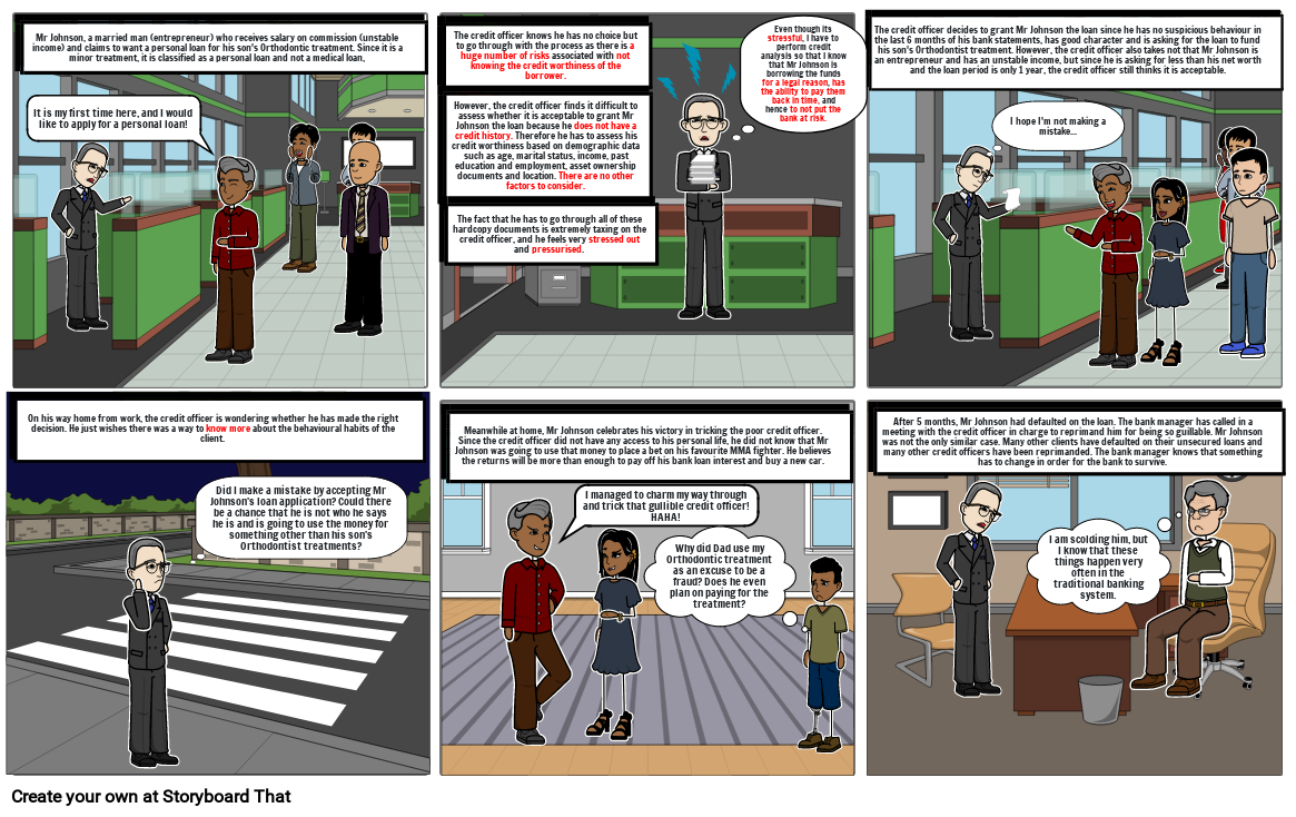 After 5 months, Mr Johnson had defaulted on the loan. The bank manager has called in a meeting with the credit officer in charge to reprimand him for being so guillable. Mr Johnson was not the only similar case. Many other clients have defaulted on their unsecured loans and many other credit officers have been reprimanded. The bank manager knows that something has to change in order for the bank to survive.