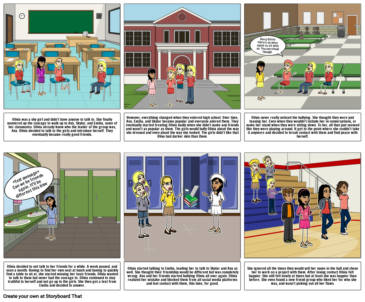 Olivia was a shy girl and didn't have anyone to talk to. She finally mustered up the courage to walk up to Ava, Skylar, and Emilia, some of her classmates. Olivia already knew who the leader of the group was, Ava. Olivia decided to talk to the girls and introduce herself. They eventually became really good friends.