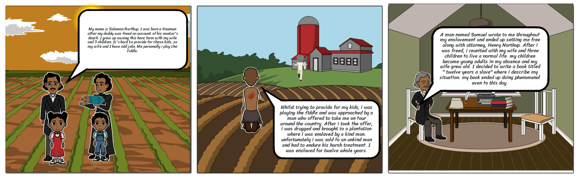A man named Samuel wrote to me throughout my enslavement and ended up setting me free along with attorney, Henry Northup. After i was freed, i reunited with my wife and three children to live a normal life. my children became young adults in my absence and my wife grew old. I decided to write a book titled " twelve years a slave" where i describe my situation. my book ended up doing phenomenal even to this day.