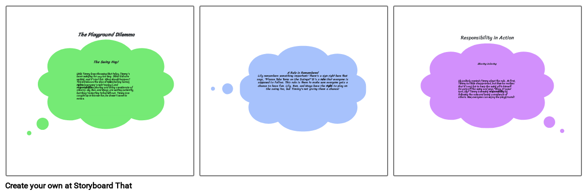 The Playground DilemmaThe Swing Hog!Little Timmy loves the swing! But today, Timmy's been swinging for way too long. Other kids are waiting, and it's not fair. What should happen? This introduces the idea of rules (taking turns), rights (everyone's right to play), and responsibilities (sharing and being considerate of others). Lily, Ben, and Maya, are waiting patiently, but they're starting to feel left out. Timmy is so caught up in his own fun, he doesn't seem to notice.