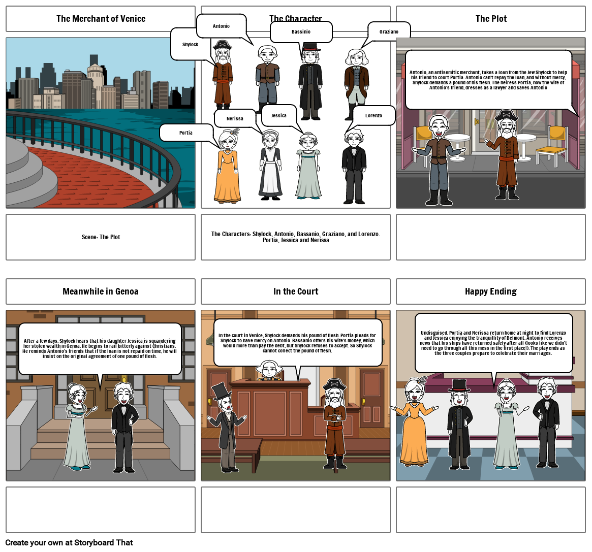 The Characters: Shylock, Antonio, Bassanio, Graziano, and Lorenzo. Portia, Jessica and Nerissa