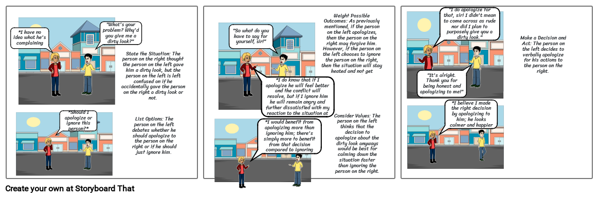 Weight Possible Outcomes: As previously mentioned, if the person on the left apologizes, then the person on the right may forgive him. However, if the person on the left chooses to ignore the person on the right, then the situation will stay heated and not get resolved as fast.